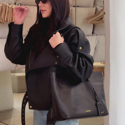 Містка та елегантна сумка Emeli виготовлена з натуральної шкіри чорного кольору. Стриманий відтінок підкреслює універсальність аксесуару, а лаконічний дизайн Emeli доповнений акуратною шкіряною біркою з тисненням логотипа INCARNE™.