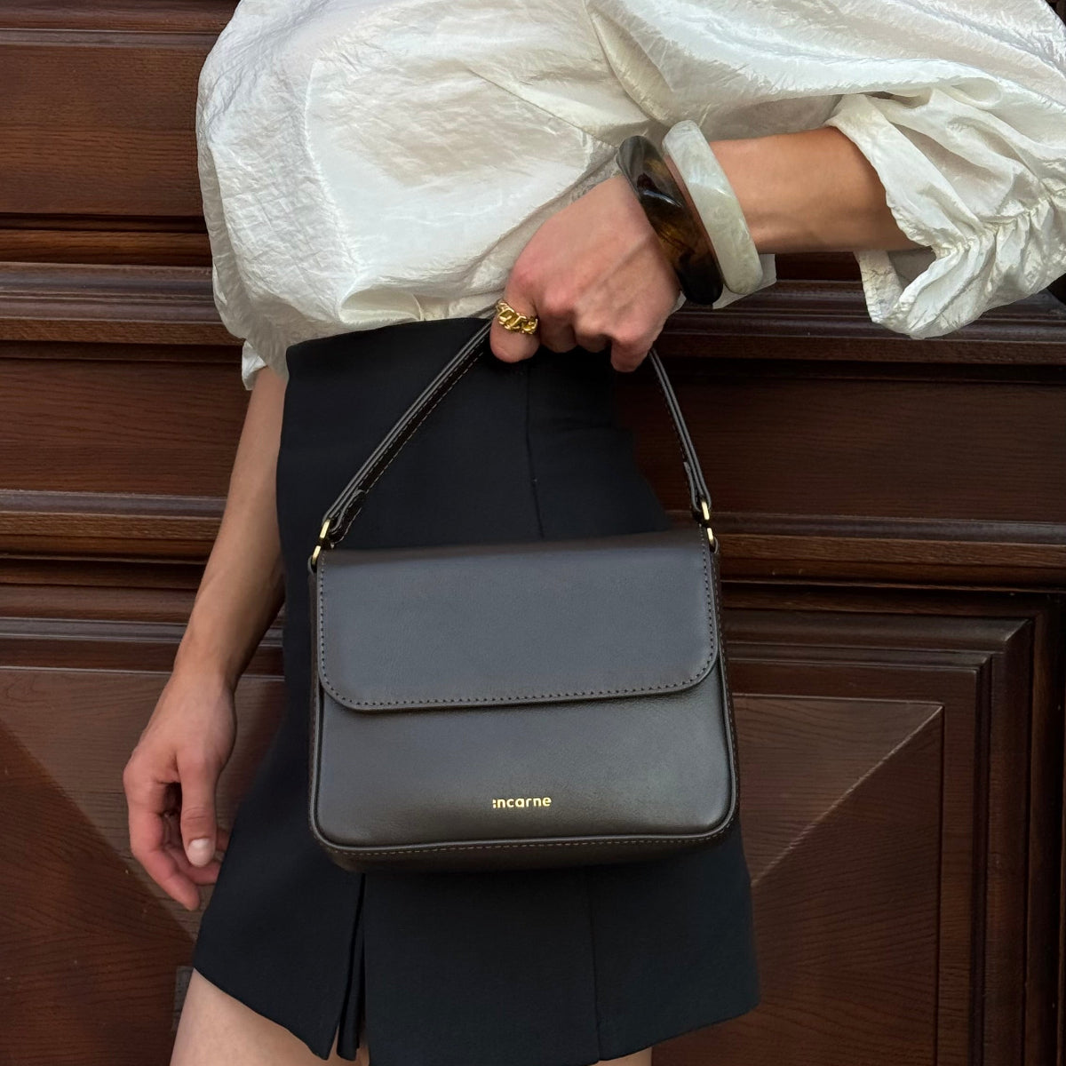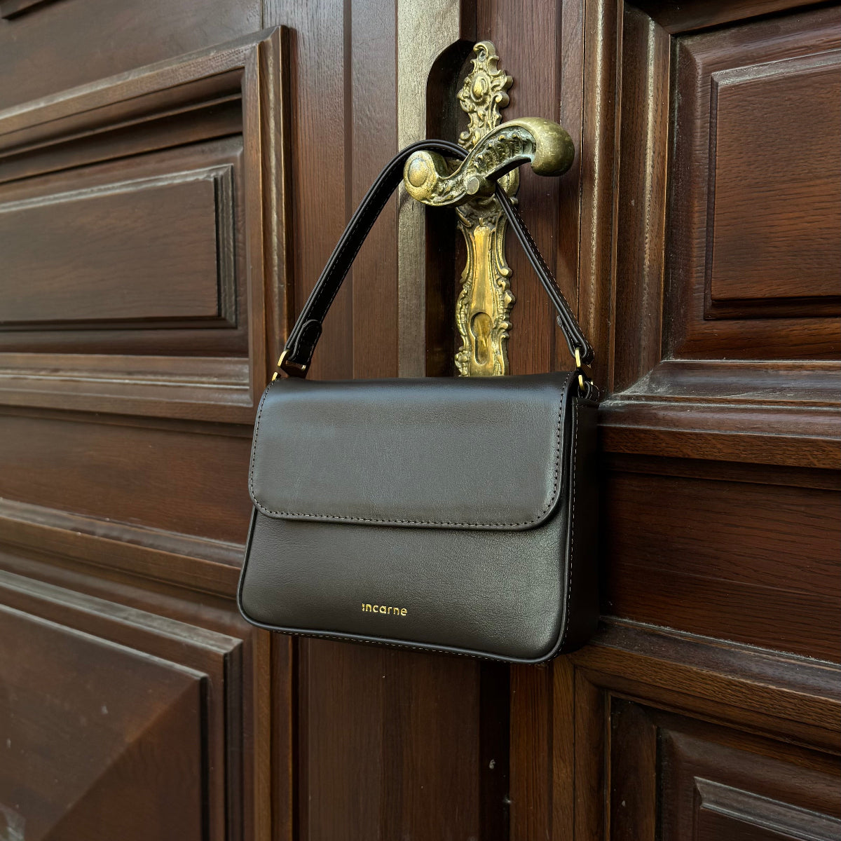 Сумка з натуральної шкіри Fancy — втілення стриманої елегантності та практичності. Виготовлена зі шкіри насиченого кольору шоколад, яку гармонійно доповнює металева фурнітура та золоте тиснення логотипу INCARNE™.