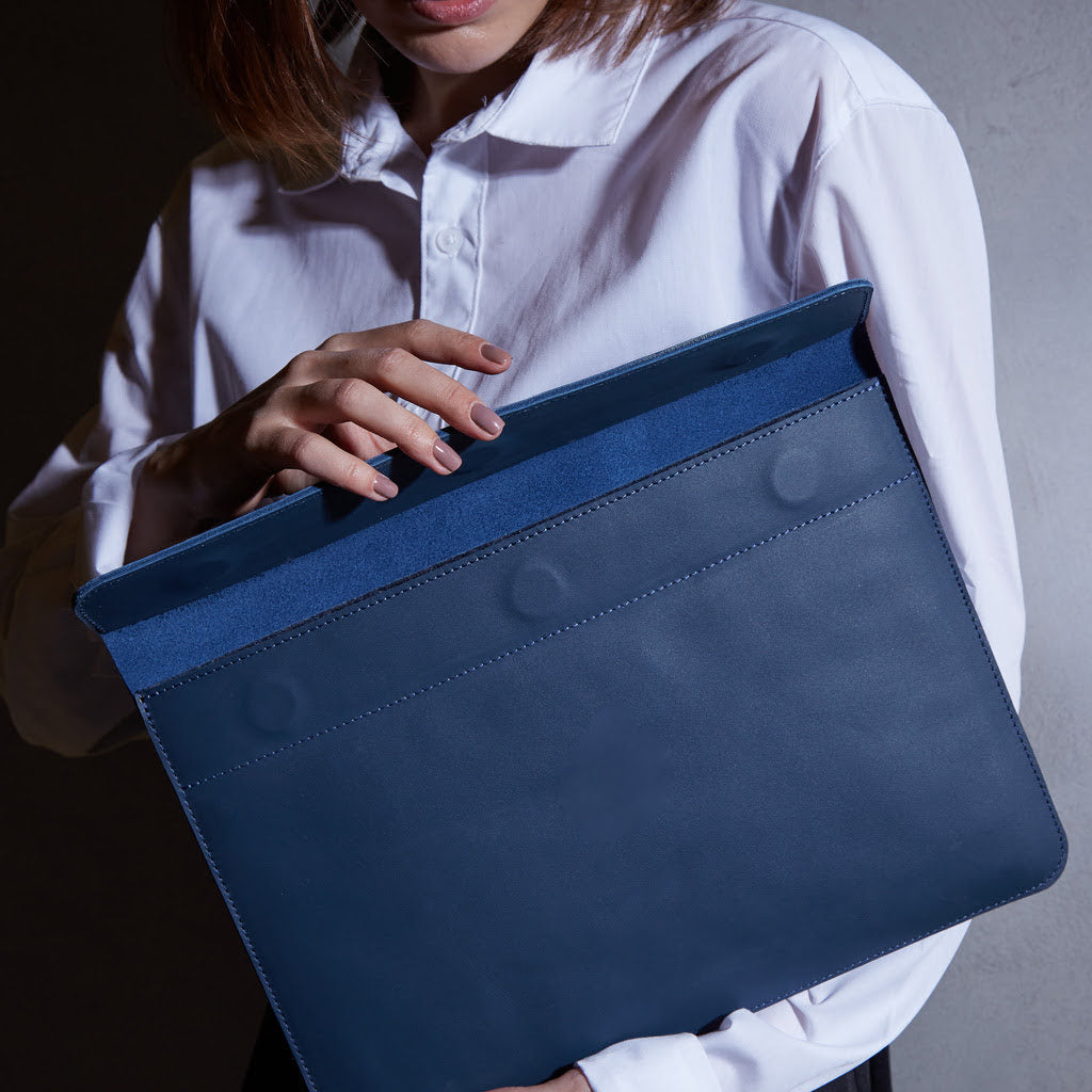 Чохол для Макбуку Klouz виготовлений з класичної шкіри синього кольору. Має лаконічний дизайн, вишукану фактуру з легким благородним блиском та тонкий силует. Закривається з допомогою клапана з прихованими магнітами. Всередині — м’яка фетрова підкладка, що забезпечує додатковий захист ноутбука від зовнішніх впливів.