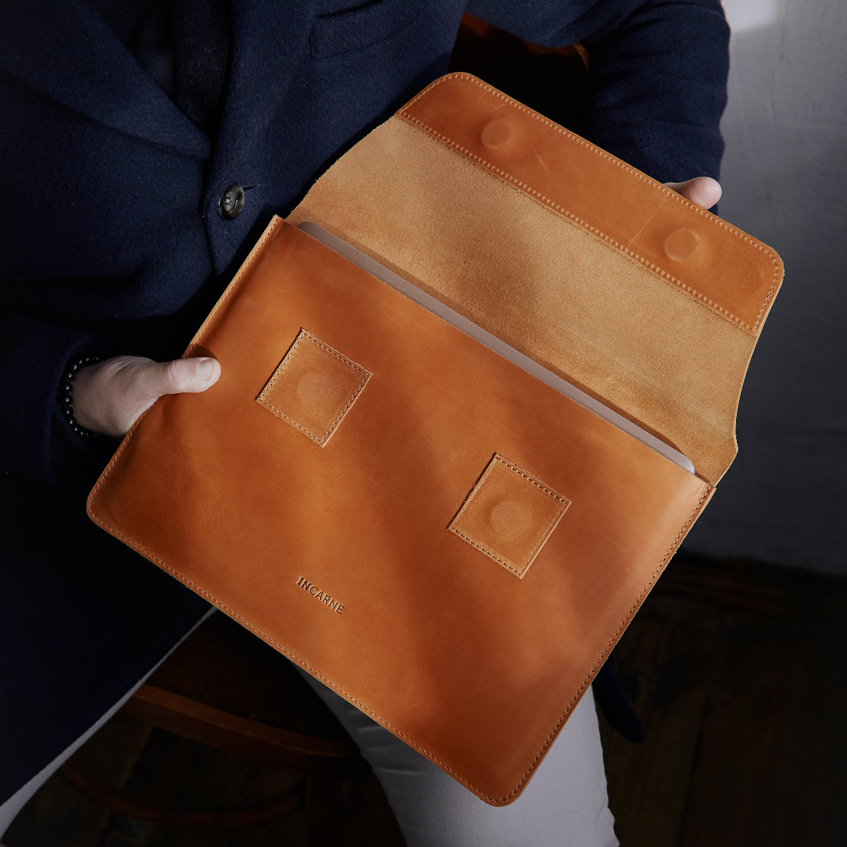 Захисний шкіряний чохол для ноутбука Line виконаний із натуральної шкіри коричневого кольору. Матеріал довговічний та міцний, зі злегка глянцевою фактурою. Чохол має клапан з прихованими магнітами, який надійно захищає пристрій всередині від зовнішніх впливів.