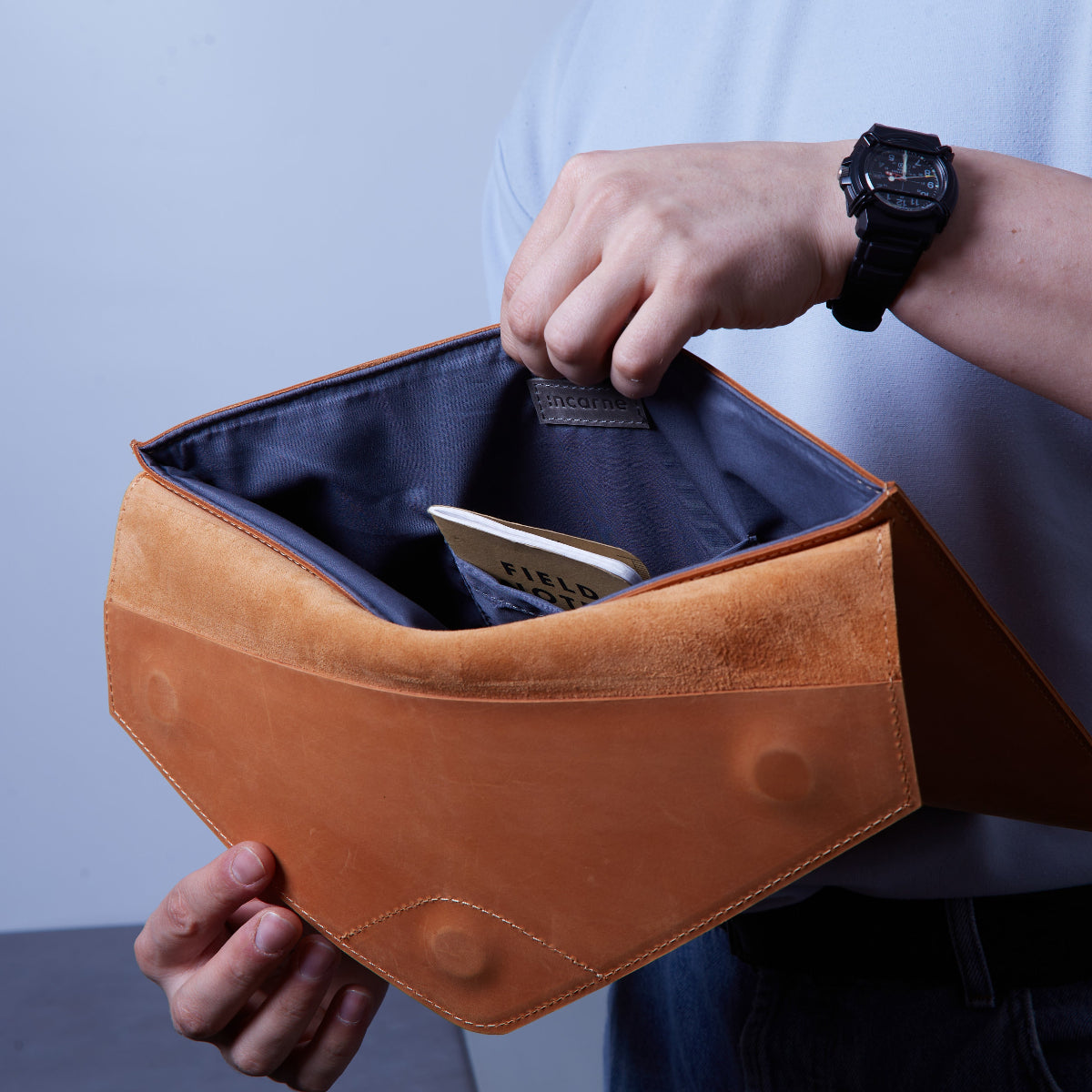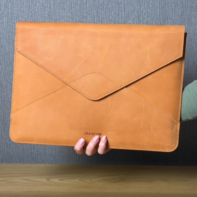 Елегантний чохол Message надійно захищає корпус пристрою від подряпин та інших пошкоджень. Виготовлений із натуральної шкіри кольору коньяк, він володіє унікальною вінтажною естетикою. Всередині має фетрову та текстильну підкладки, внутрішню кишеню для дрібниць. Закривається з допомогою клапана з прихованими магнітами.