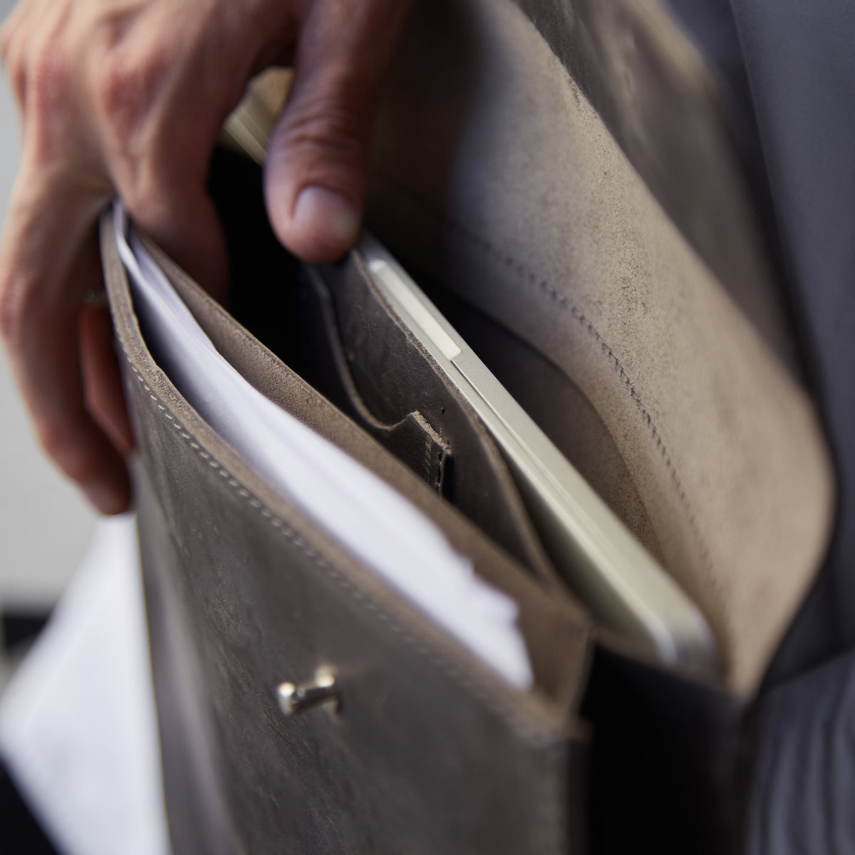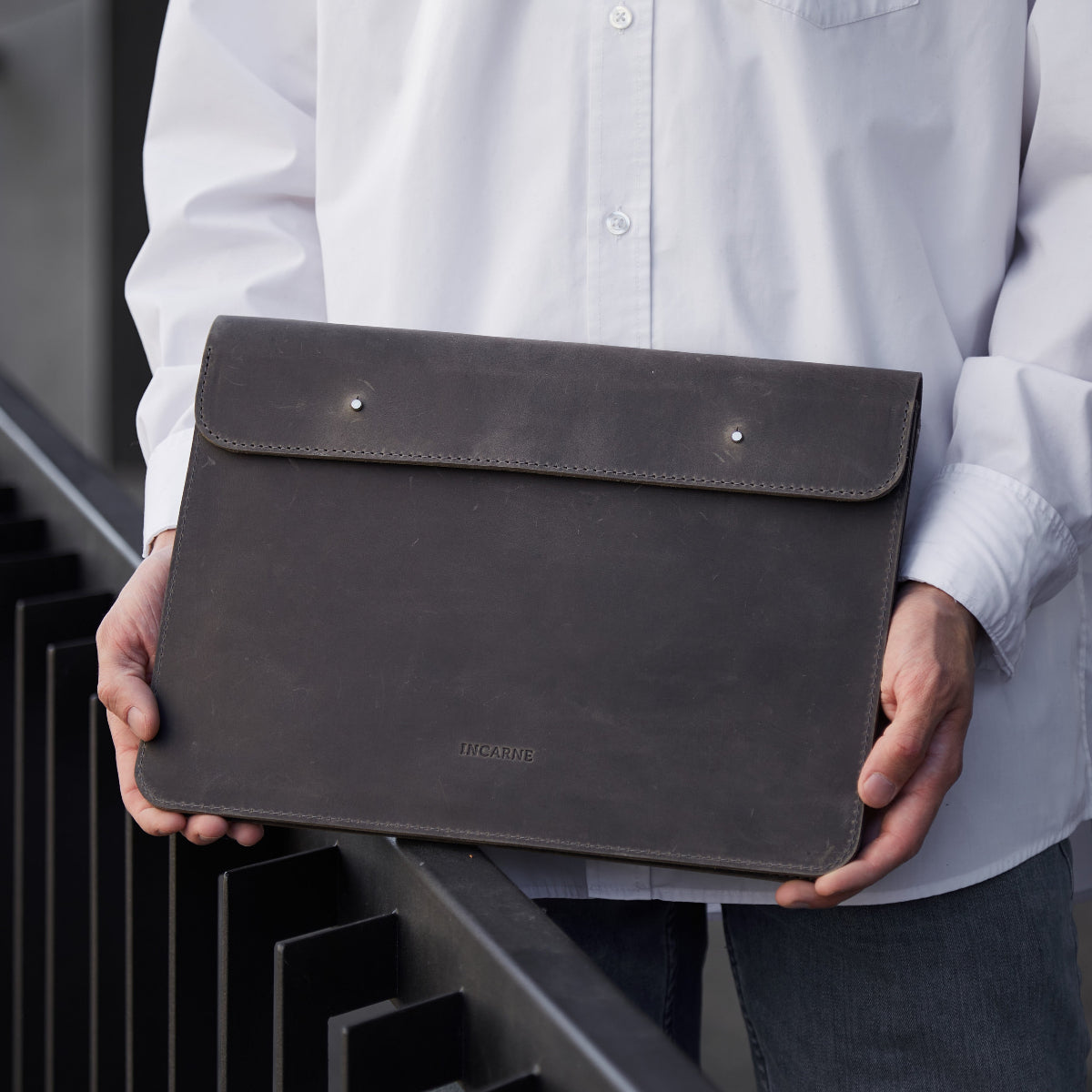 Шкіряний чохол на MacBook Neat сірого кольору — комбінація лаконічного дизайну та відмінної функціональності. Виконаний із натуральної шкіри, що забезпечує виробу високу міцність та довговічність. Закривається з допомогою клапана з кобурними гвинтами. Всередині має два відділення для ноутбука та документів, кишеню для дрібниць та слот для карток чи візитівок.