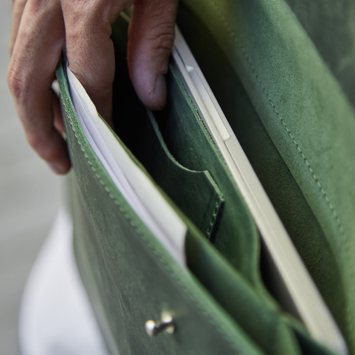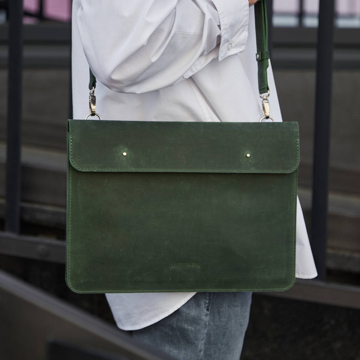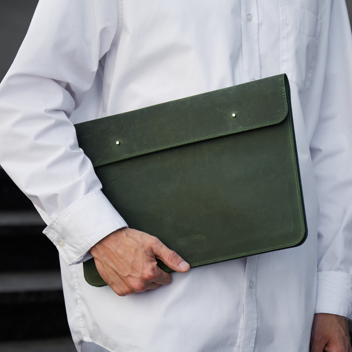 Шкіряний чохол для ноутбука Neat — елегантний аксесуар для захисту лептопа. Виготовлений із натуральної вінтажної шкіри зеленого кольору, що забезпечує виробу міцність та вишуканий вигляд. Закривається з допомогою клапана з кобурними гвинтами. Всередині має два місткі відділення, кишеню для дрібниць, а також слот для банківських карток.
