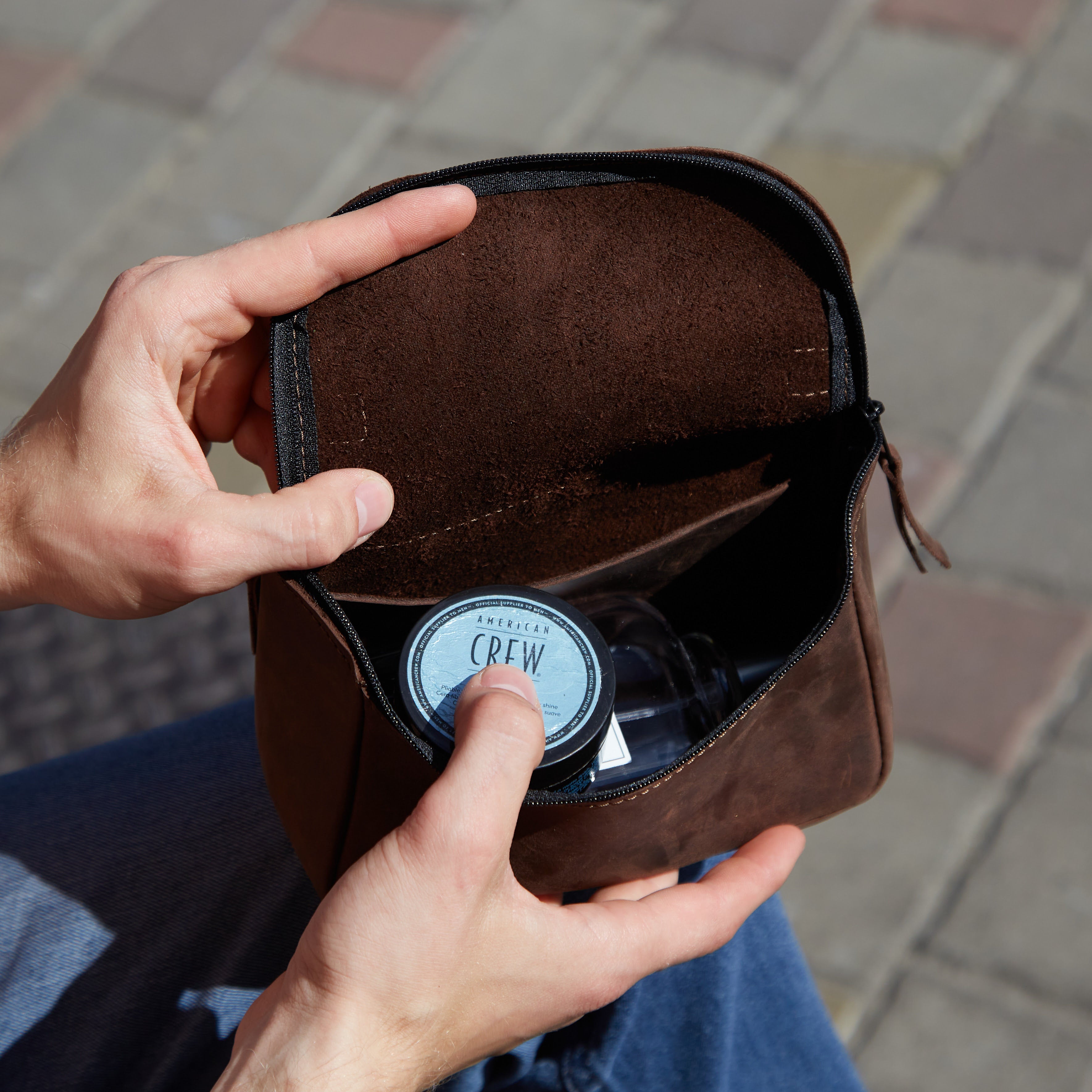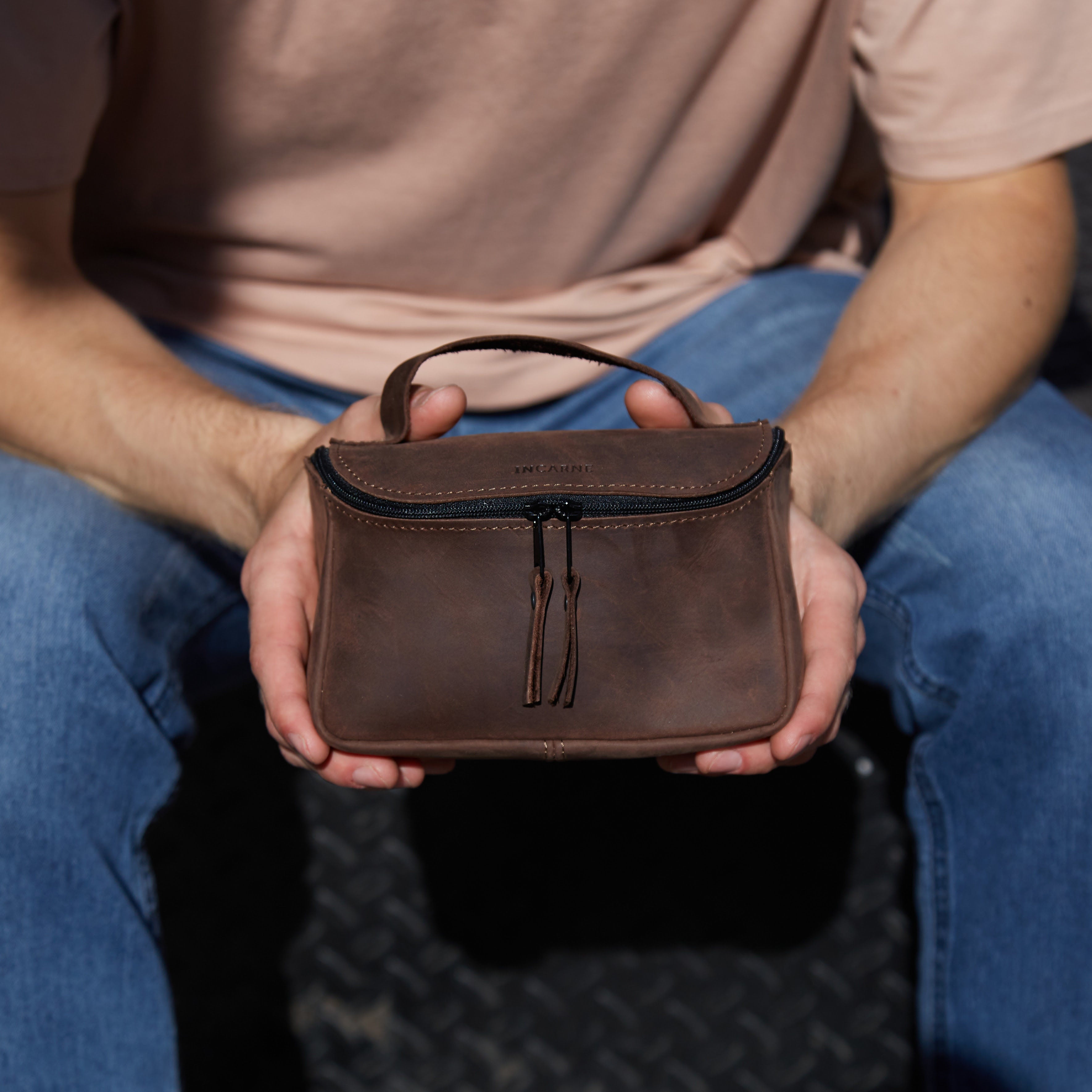 Косметичка зі шкіри для чоловіків та жінок Timeless розміру L. Виготовлена з коричневої натуральної шкіри з вінтажною фактурою. Закривається з допомогою блискавки-застібки, має зручну ручку. Всередині — просторе основне відділення без підкладки та кишеня для дрібниць.