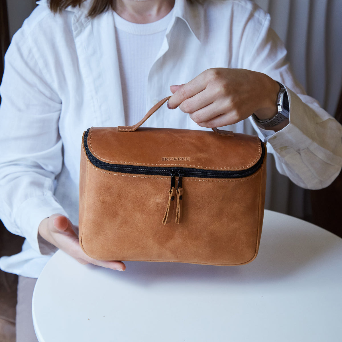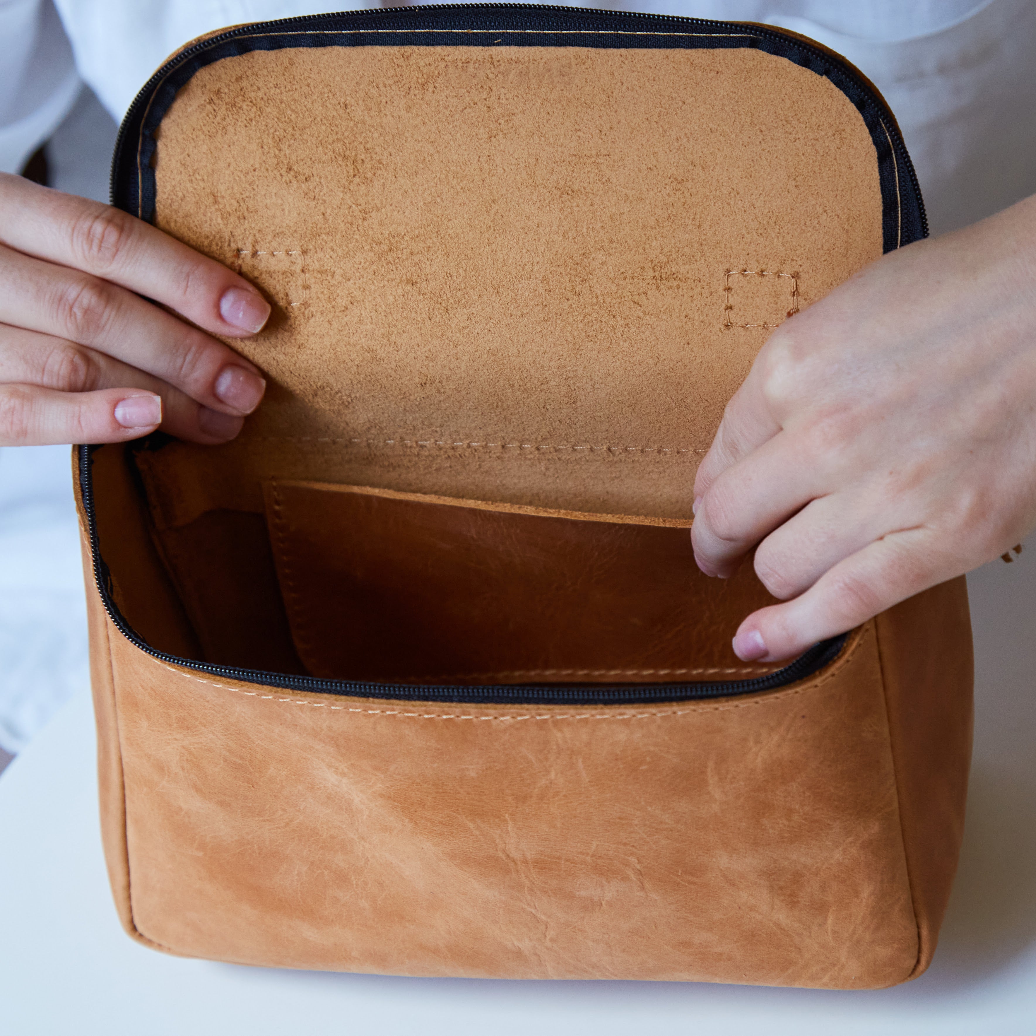 Жіноча та чоловіча шкіряна косметичка Timeless — невелика та зручна, ідеальна для зберігання базового набору косметики.