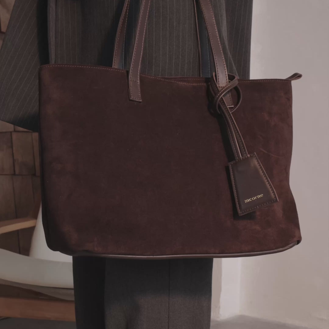 Женская сумка Emeli изготовлена из комбинации велюра и натуральной классической кожи цвета шоколад. Лаконичный дизайн дополняет кожаная бирка с золотым тиснением логотипа INCARNE™