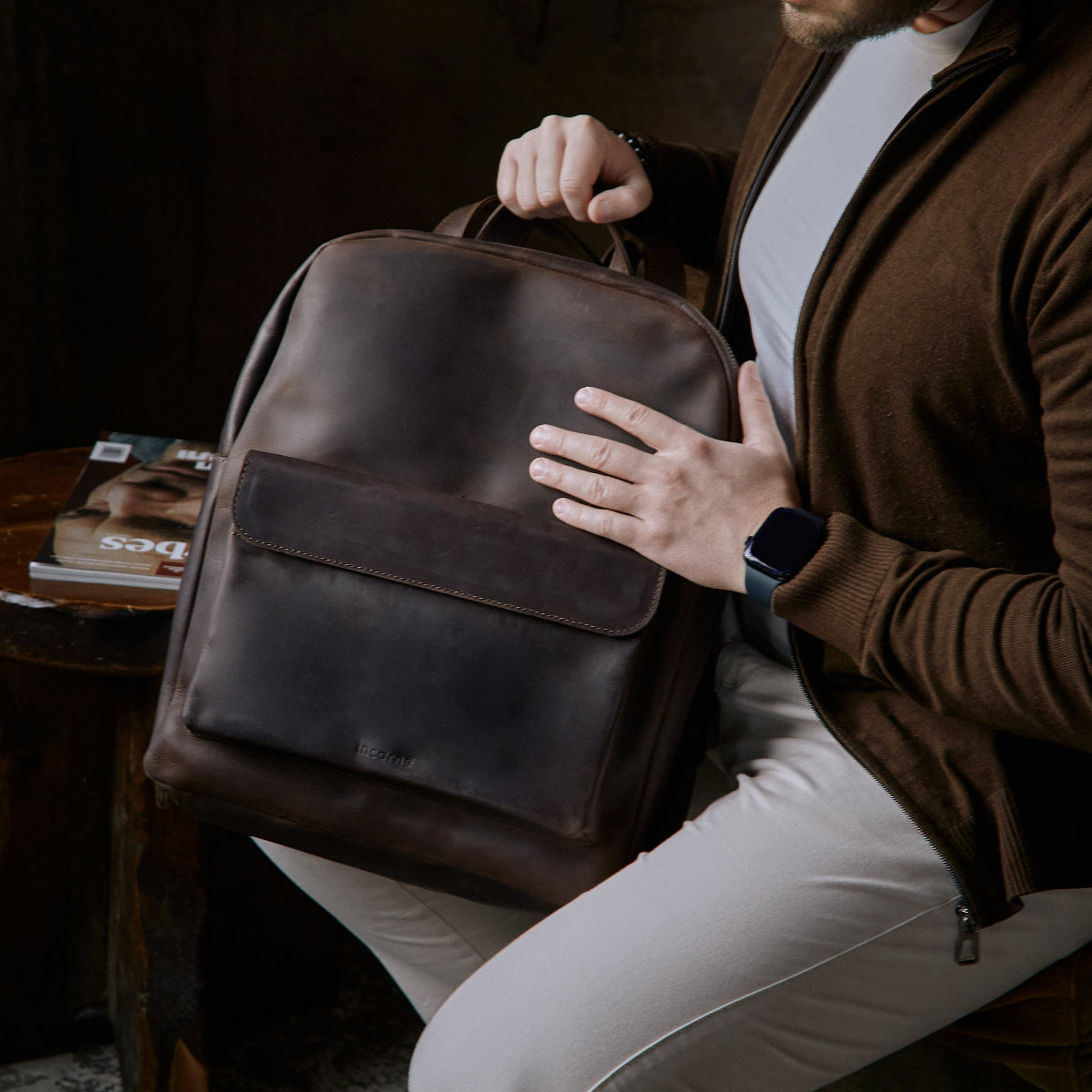 Factor – рюкзак из кожи мужской и женский. Без подкладки внутри, имеет отдельный карман для устройства: