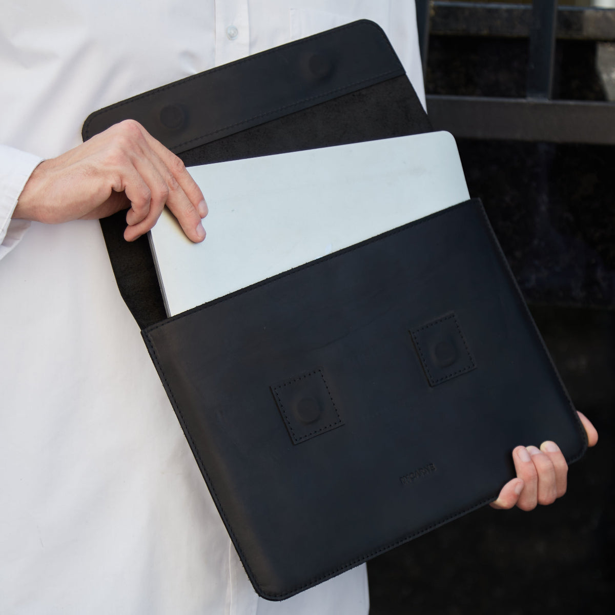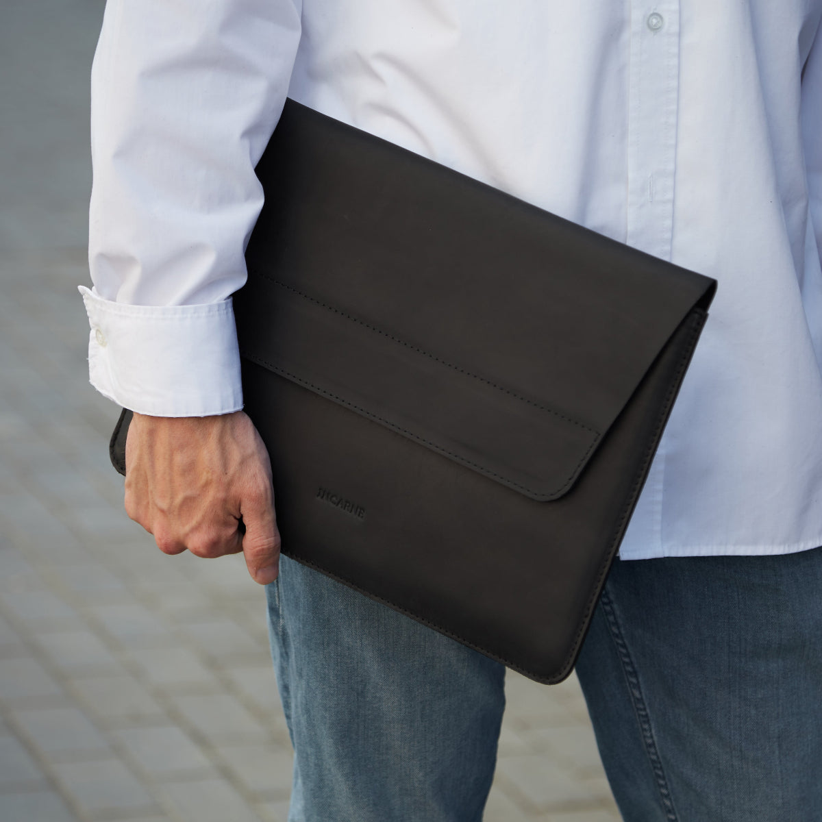 Кожаный кейс на Макбук Line в универсальном черном цвете надежно защищает устройство и стильно дополняет его. Изготовлен из натуральной винтажной кожи. Закрывается с помощью клапана со скрытыми магнитами, обеспечивающими легкий доступ к содержимому чехла.
